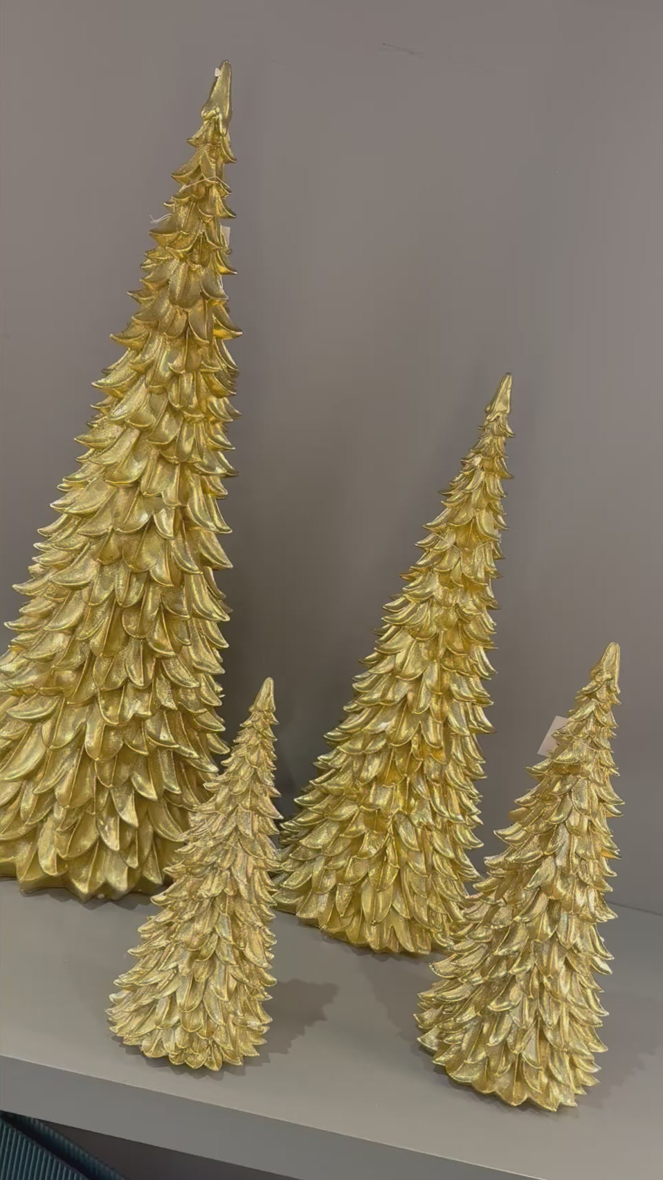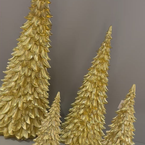 Pine trees finished in a luminous gold glaze, these sculptural trees bring a warm, modern glow to any holiday setting. Each piece showcases layered, petal-like carving that adds texture, depth, and artisanal charm. Beautiful grouped together or styled individually, they create an elegant winter statement for mantels, consoles, and festive tables capes.