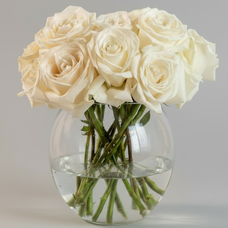 24 white roses displayed in a clear round glass vase.