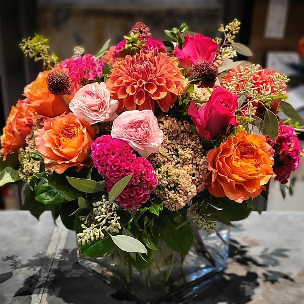 A rich symphony of autumn blooms celebrating the warmth of Thanksgiving. Glowing orange roses, bold dahlias, and vibrant fuchsia celosia come together in perfect harmony