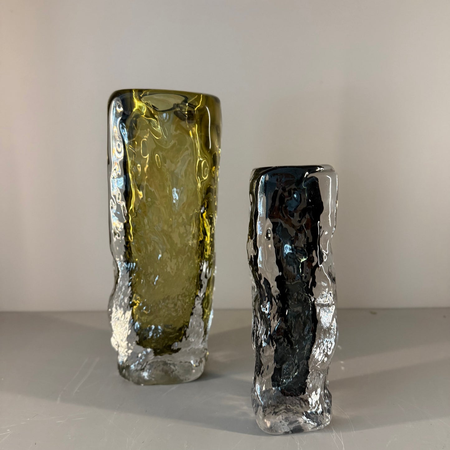 A study in contrast and clarity, the Molten Edge Duo is a set of sculptural vases hand-formed from thick glass with a raw, organic texture. Each piece evokes the sensation of molten rock frozen mid-flow — one tinted in earthy olive, the other in smoke-charcoal black, both encased in crystal-clear forms.