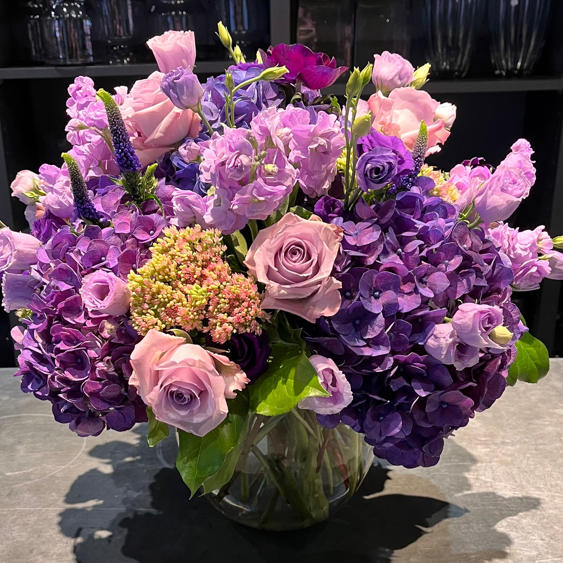 Deep jewel tones meet soft blush florals in an arrangement that symbolizes blessings and fresh starts